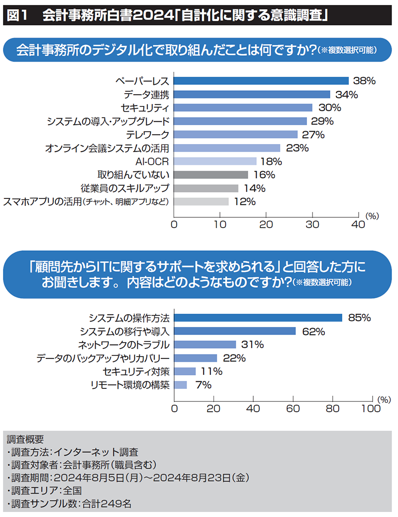 まずは直近の状況を整理してみましょう。会計事務所白書2024「自計化に関する意識調査」(図1)にて、「会計事務所でどのようなデジタル化に取り組んだか」について尋ねたところ、「ペーパーレス」が38%と最も多く、「データ連携」(34%)、「セキュリティ」(30%)への対応が続きました。電子帳簿保存法(電帳法)の改正やインボイス制度などによる環境の変化で、まずは「ペーパーレス」「データ連携」に取り組み、会計事務所業務のデジタル化を進めようとしていることがうかがえます。