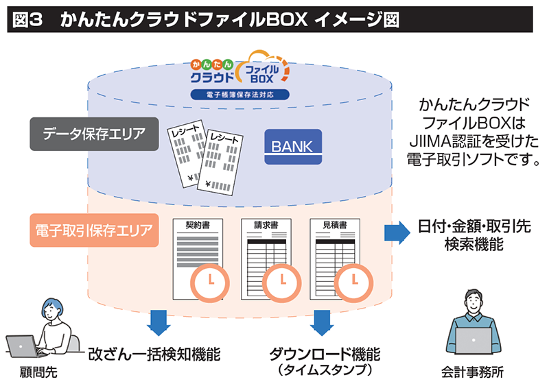 次に、クラウドの活用についてですが、紙のレシート、領収書、通帳などをカメラで撮影、もしくはスキャナーなどで電子化し、それらの電子データを保管できる環境を整備することが肝要です。「かんたんクラウドファイルBOX」は、顧問先が直接レシートや領収書などの証憑をアップロードできるため、会計事務所はこれらの証憑回収のために顧問先に出向く必要がなくなります(図3)。それにより、AI‐OCR入力が活用できます。会計・所得税確定申告に加え、本年度から年末調整にも対応しました。さらに紙や画像データを回収しない方法としてスマートフォンを利用した「Edge Tracker経費精算・年末調整申告」などを導入する会計事務所も急速に増えています。最近は顧問先自身が紙から電子にしてほしいと会計事務所に要請するケースも増えています。