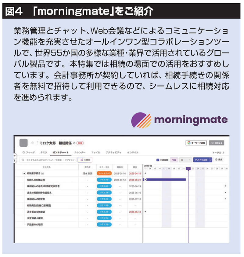 最後にコミュニケーションツールの活用についてですが、会計事務所と顧問先の双方でスケジュールの進捗状況を共有できるツールを導入すると、特に相続案件の管理で役立ちます。相続人側ではどんな手続きをいつまでに済ませ、会計事務所側はいつまでに対応すればよいかが一目瞭然になるのです(図4)。