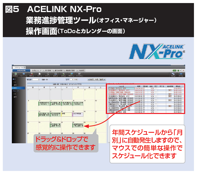 まず、業務の進捗管理ですが、これは決算書、法人税申告書、経営分析書類の作成といった「期限がある業務(タスク)」が該当します。そのためには職員全員のToDo(期限が定まっていない業務)を可視化し、職員全員で情報共有するところから始めましょう。これには「ACELINK NX‐Pro業務進捗管理」(オフィス・マネージャー)の活用がおすすめです(図5)。各人が抱えているToDoはカレンダーを介して情報共有でき、感覚的に入力操作が可能です。年間スケジュールを登録していれば、決算など、必要なタスクを自動作成するので、対応漏れを防止できるのも利点です。また、期日のアラート機能も付与できますので、ぜひ活用いただければと思います。