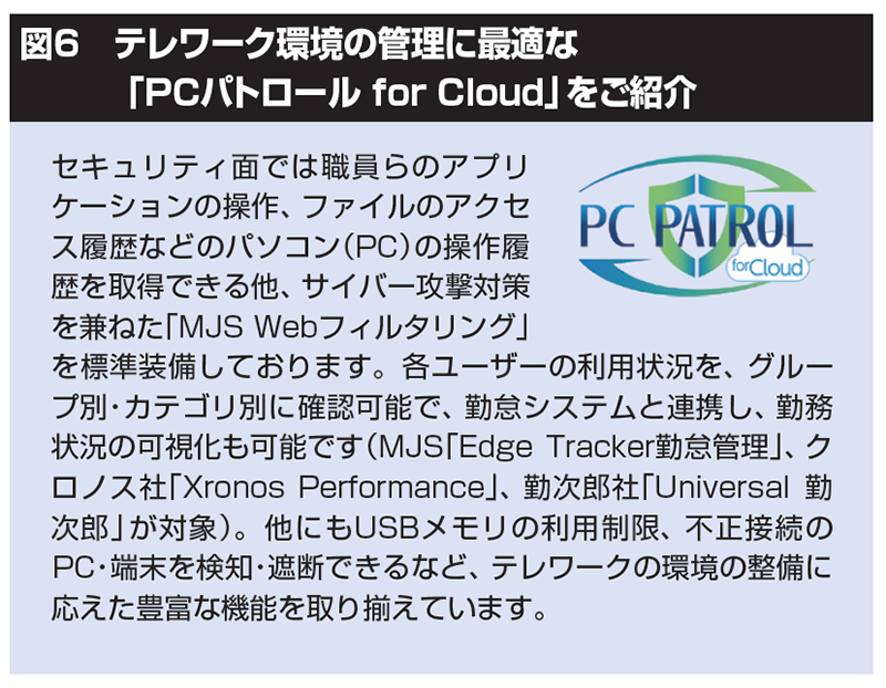 加えて、会計事務所は改正個人情報保護法に基づきPCの操作履歴を収集しておく必要があります。これは他にもテレワークの実施には毎日必ず業務日報や進捗報告を上長に提出するといった「勤務状況の報告」、テレワークで使用している端末に顧問先のデータを絶対に残さないようにする「守秘義務の遵守」といった課題がありますが、これらへの対応策としてログ監視システム(図6)の導入をおすすめしています。