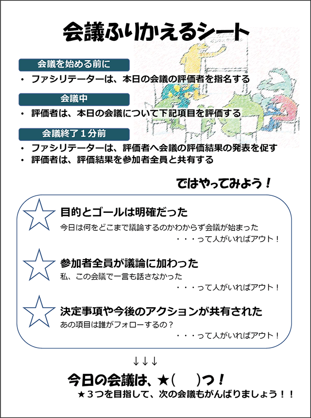 もう1点、誰かひとりが「私がこのダメな会議を改革せねば」と期待値を高く設定しすぎて抱え込んでしまうのもよくありません。「会議のファシリテーション」は、その考え方や意識を複数の参加者と共有してから実践するのが望ましいと思います。例えば私のクライアント企業の方がよくやっているのが、私の会議術の書籍やブログを回し読み・共有して「ちょっとこれやってみよう」と話し合うという方法。どんなに小さな企業改革もたった一人で行うのは難しいので、まずは「会議のファシリテーション」を共通言語化してみることをオススメします。